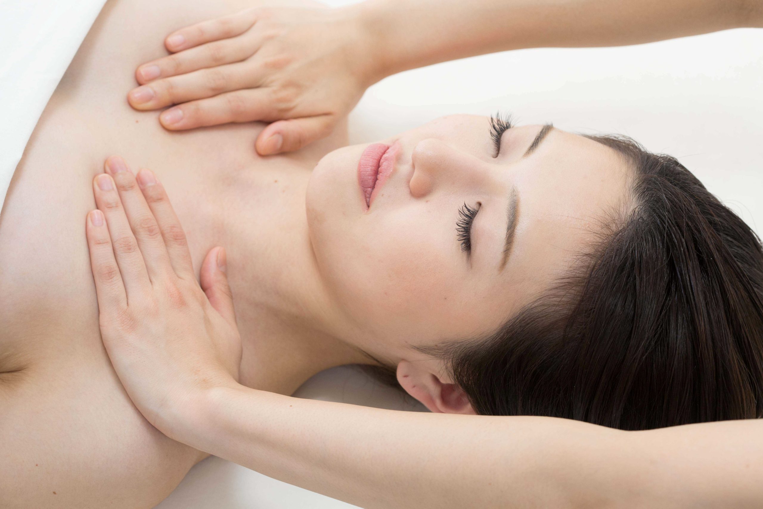 肩、首、胸元からトリートメントし、顔全体をスッキリと引き締めていきます。