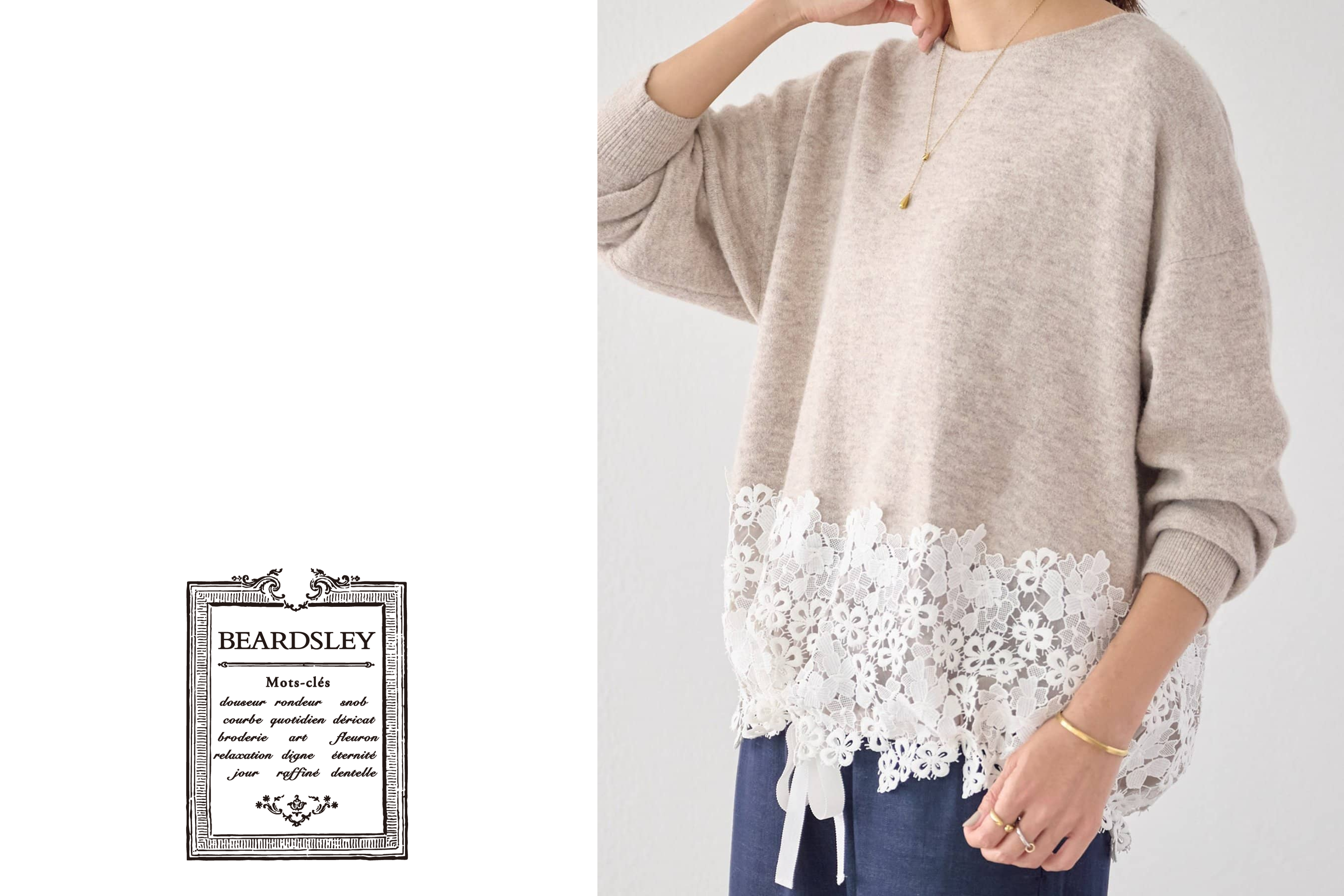 レースデザインならではの華やかさと、ニットの着やすさを兼ね備えた一枚です。